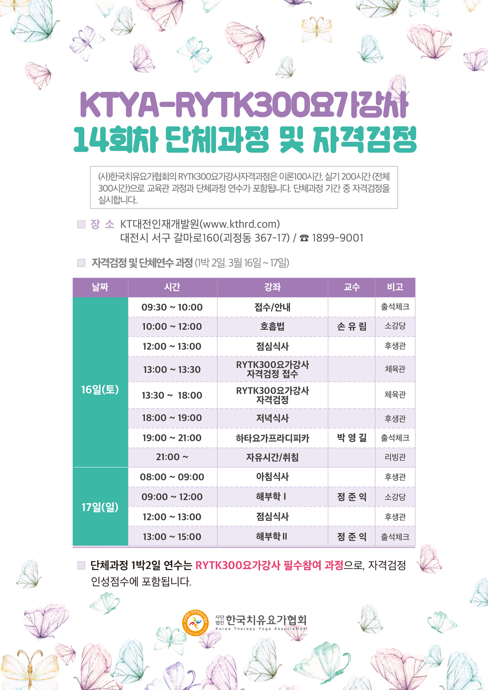 3¿ù 16ÀÏ(Åä) -17ÀÏ(ÀÏ) 13ȸÂ÷ ´Üü°úÁ¤ 1¹Ú2ÀÏ ¿¬¼ö ¹× ÀڰݰËÁ¤ÀÌ ½Ç½ÃµË´Ï´Ù.1¹Ú2ÀÏ¿¬¼ö- 3¿ù 16ÀÏ(Åä)~ 17ÀÏ(ÀÏ)ÀڰݰËÁ¤ - 3¿ù 16ÀÏ(Åä) ¿ÀÈÄ 1½Ã30ºÐ~ 6½ÃÀå¼Ò- KT´ëÀüÀÎÀç°³¹ß¿ø** 1¹Ú2ÀÏ ¿¬¼ö ¹× ÀڰݰËÁ¤ Áغñ»çÇ×- ·ÎÁîÇÎÅ© ³ªµð¿ä°¡¸ÅÆ®, °³ÀÎ ³×ƼÆÌ ¹× °³ÀÎ ÅÒºí·¯, Çʱ⵵±¸. ±× ¿Ü ¼÷¹Ú¿ë °³Àοëǰ- ·ÎÁîÇÎÅ© ³ªµð¿ä°¡¸ÅÆ®´Â ÇöÀå ´ë¿© °¡´É.- °³ÀÎ ³×ƼÆÌÀº ´ë¿©, ÆÇ¸Å ¾øÀ¸´Ï ±úÁöÁö ¾Êµµ·Ï À¯ÀÇÇÕ´Ï´Ù.- °³ÀÎ ÅÒºí·¯ Áغñ, °ËÁ¤ Àü¿¡ ¿Â¼ö Áغñ ÇØÁֽñ⠹ٶø´Ï´Ù.- ¿ä°¡º¹ »ö»óÀº ¿©ÀÚ-ÇÏÀÇ ºí·¢/»óÀÇ ºÓÀº»ö(ÀÚÁÖ, ¿ÍÀÎ, ¹ö°Çµð µî), ³²ÀÚ- ºí·¢À̳ª ±×·¹ÀÌ, û»ö °è¿·Î·Î Áغñ ºÎʵ右´Ï´Ù.- ÀڰݰËÁ¤ ÇöÀå ½É»çºñ(5¸¸¿ø). °ËÁ¤ Á¢¼ö ½Ã ³³ºÎÇÕ´Ï´Ù.- ÀڰݰËÁ¤¼ø¼: Àß¶ó³×Ƽ¤ÑÈ£Èí¤Ñ¼ö¸®¾ß³ª¸¶½ºÄ«¶ó¤ÑÇ¥Áؾƻ糪20¤Ñ¾Æ»ç³ªÆ¼Äª- 3¿ù 16ÀÏ(Åä) 09:30ºÐ±îÁö KT´ëÀüÀÎÀç°³¹ß¿ø Á¦1¿¬¼ö°ü ¼Ò°´ç¿¡ µµÂø, ´Üü°úÁ¤ Ã⼮üũ ¹× Áöħ¼ ¼ö·É.- ±ÍÁßǰÀº °³ÀÎ º¸°ü ÂüÁ¶- ÁÖÂ÷ 1ÀÏ 3000¿ø** 14ȸÂ÷ ÀڰݰËÁ¤Àº 3¿ù 16ÀÏ(Åä)¿¡ ½Ç½ÃµÊÀ» ´Ù½ÃÇѹø È®ÀÎ ¹Ù¶ø´Ï´Ù.
