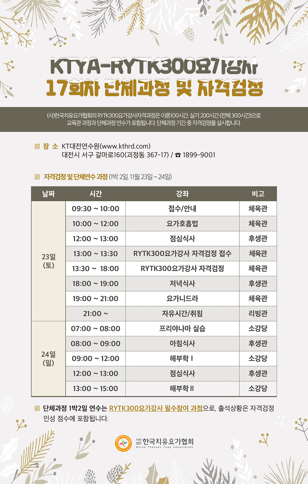 [17ȸÂ÷ RYTK300¿ä°¡°»ç ´Üü°úÁ¤ ¿¬¼ö ¹× ÀڰݰËÁ¤ ½Ç½Ã]11¿ù 23ÀÏ(Åä) -24ÀÏ(ÀÏ) 17ȸÂ÷ ´Üü°úÁ¤ 1¹Ú2ÀÏ ¿¬¼ö ¹× ÀڰݰËÁ¤ÀÌ ½Ç½ÃµË´Ï´Ù.1¹Ú2ÀÏ¿¬¼ö- 11¿ù 23ÀÏ(Åä)¿ÀÀü 10½Ã ~ 24ÀÏ(ÀÏ) ¿ÀÈÄ 3½ÃÀڰݰËÁ¤ - 11¿ù 23ÀÏ(Åä) ¿ÀÈÄ 1½Ã30ºÐ~ 6½ÃÀå¼Ò- KT´ëÀüÀÎÀç°³¹ß¿ø** 1¹Ú2ÀÏ ¿¬¼ö ¹× ÀڰݰËÁ¤ Áغñ»çÇ×- º»ÀÎ ½ÅºÐÁõ- ·ÎÁîÇÎÅ© ³ªµð¸ÅÆ®, °³ÀÎ ³×ƼÆÌ ¹× °³ÀÎ ÅÒºí·¯, Çʱ⵵±¸, ¼÷¹Ú¿ë °³Àοëǰ- ¿ä°¡º¹ »ö»ó- ¿©ÀÚ-ÇÏÀÇ ºí·¢/»óÀÇ ºÓÀº»ö(ÀÚÁÖ, ¿ÍÀÎ, ¹ö°Çµð µî)³²ÀÚ- ºí·¢À̳ª ±×·¹ÀÌ, û»ö °è¿- ÀڰݰËÁ¤ ÇöÀå ½É»çºñ(5¸¸¿ø). °ËÁ¤ Á¢¼ö ½Ã Çö±Ý ³³ºÎ- 11¿ù 23ÀÏ(Åä) 09:30ºÐ±îÁö üÀ°°ü¿¡ µµÂø, Ã⼮üũ ¹× Áöħ¼ ¼ö·É** 17ȸÂ÷ 1¹Ú2ÀÏ¿¬¼ö ù³¯ 23ÀÏ ÀÏÁ¤Àº üÀ°°ü¿¡¼ ÁøÇàµÊÀ» Âü°í¹Ù¶ø´Ï´Ù.** ¶ÇÇÑ 24ÀÏ ¿ÀÀü7½Ã 'ÇÁ¸®¾ß³ª¸¶ ½Ç½À' ½Ã°£ÀÌ Ãß°¡µÇ¾ú½À´Ï´Ù.